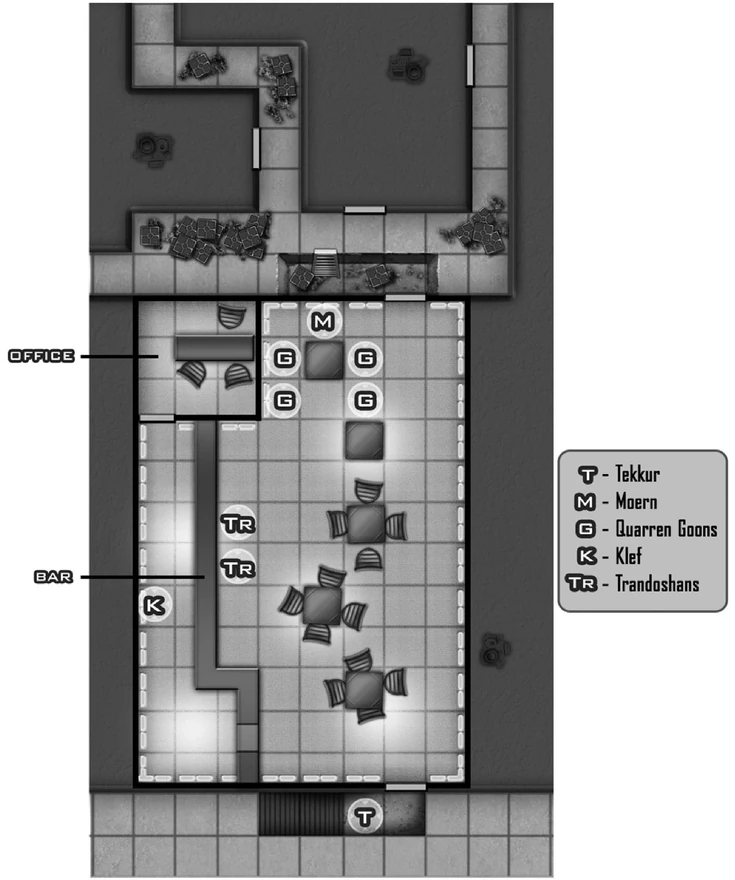 The heroes enter the cantina through the door at the south end of the encounter map. Tables and chairs are scattered around the interior of the tavern as depicted on the map. Tavik Moern and his Quarren Goons are at the northern end of the room, standing between the heroes and the rear exit of the cantina.